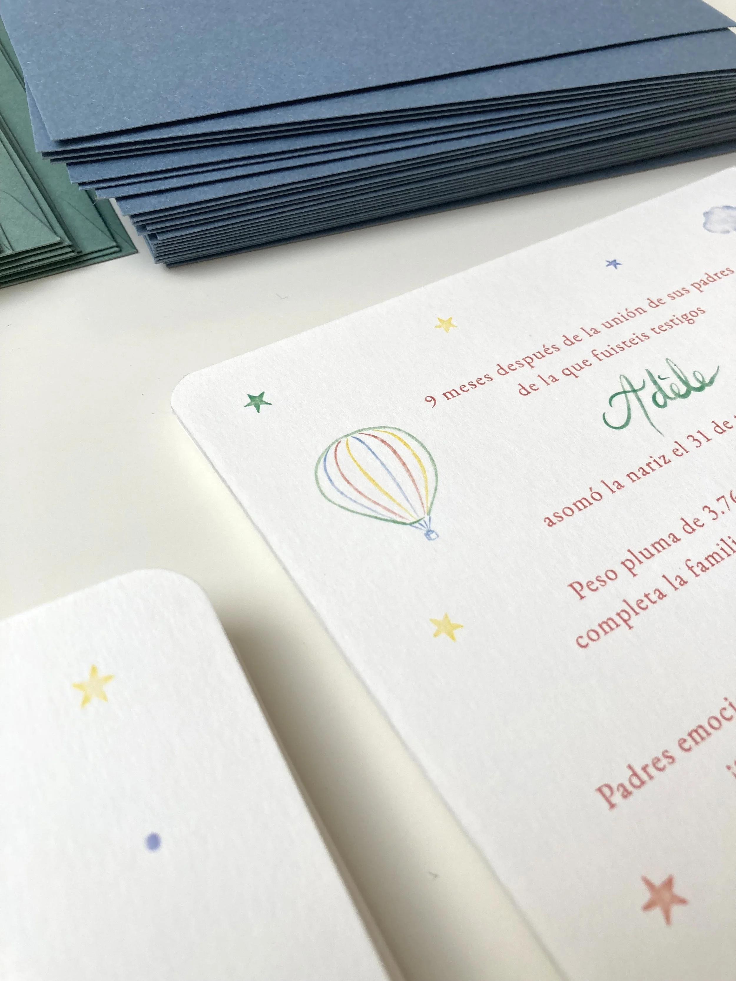 Après avoir réalisé la papeterie de mariage de L&A l’année dernière (faire-part, menus, plan de table, livret de messe, carte des cocktails, noms de table… J’ai eu le plaisir de réaliser cette année les faire-part de naissance de leur fille Adèle. Les jeunes parents souhaitaient des couleurs douces, des étoiles, un nuage, une montgolfière,… en français et en espagnol.